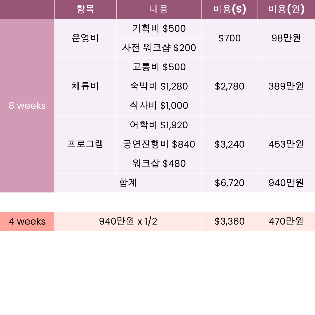 *다음은 샘플 스케줄로 공연이나 워크샵이 있는 날에는 조정됩니다. 첫째 주 월요일에는 오리엔테이션이 있습니다.